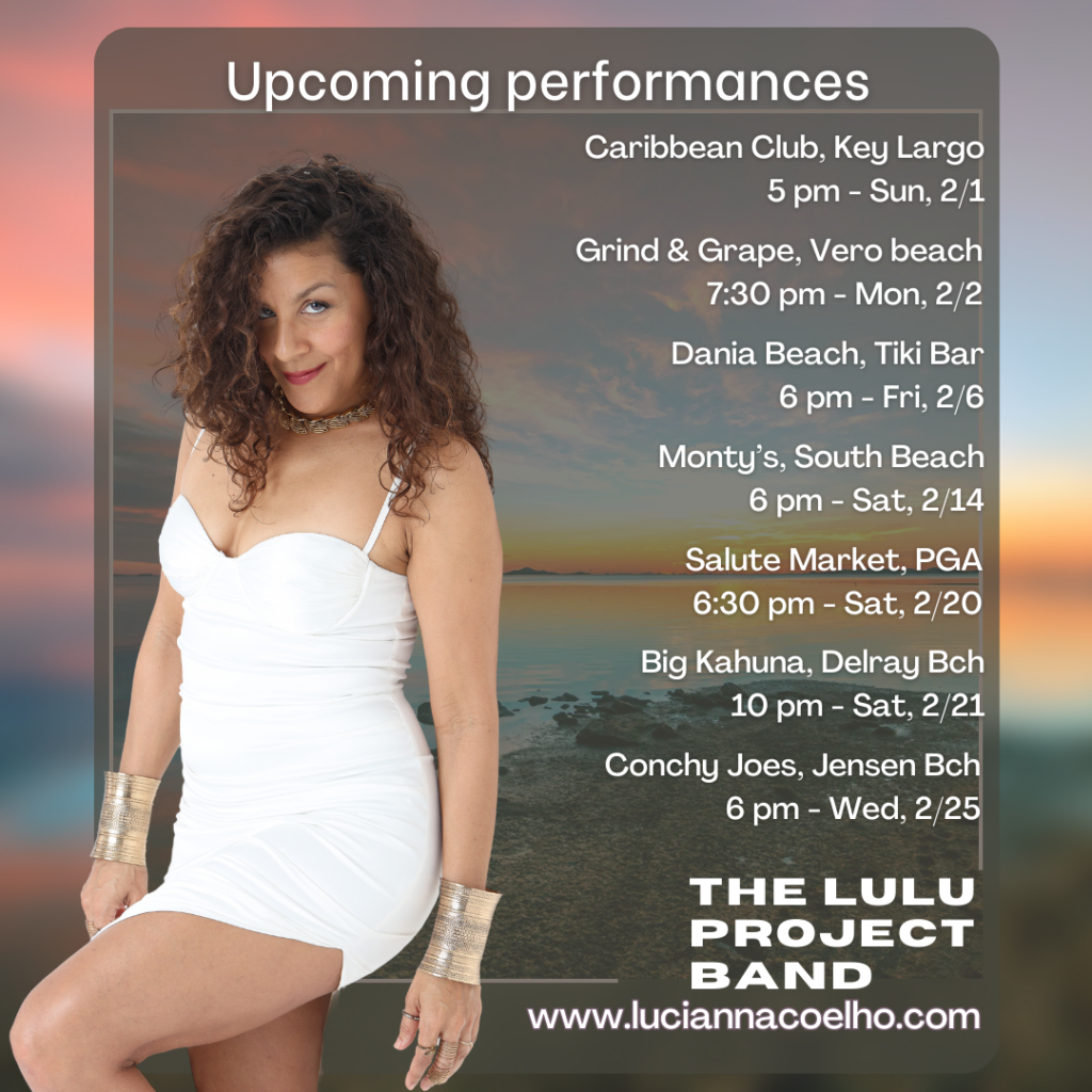 Explore live performance videos from Lucianna Coelho and her professional South Florida band (The Lulu Project Band), captured at corporate events, private parties, galas, country clubs, and special celebrations. These videos showcase our versatility across genres, live energy, and ability to connect with diverse audiences in real event settings.